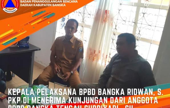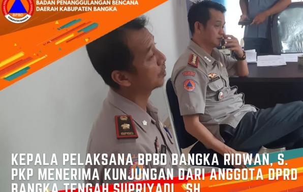BPBDBANGKA, BANGKA - Kepala Pelaksana Bpbd Bangka bapak RIDWAN , S. PKP di dampingi Sekretatis Badan Bpbd Bangka bapak BUDI GUSTIANSYAH S. KEP , menerima Kunjungan Angoota DPR-D Kabupaten Bangka Tengah bapak SUPRIYADI , SH Terkait kunjungan bpbd kabupaten bangka ke bpbd bangka tengah pada tanggal 15 februari 2023 ,  untuk Kegiatan Koordinasi dan Konsultasi mengenai Rencana Aksi SPM dan Kajian Ilmiah Usulan Tunjangan Resiko. Kunjungan dilakukan pada pukul 11:00 WIB yang bertempat di Kantor BPBD Kabupaten Bangka, Kedatangan tersebut disambut dengan hangat dari pihak BPBD Kabupaten Bangka yang dipimpin langsung oleh Kepala Pelaksana Bpbd Bangka bapak RIDWAN , S. PKP yang di dampingi Sekretatis Badan Bpbd Bangka bapak BUDI GUSTIANSYAH S. KEP dan Staf Pendukung lainya.