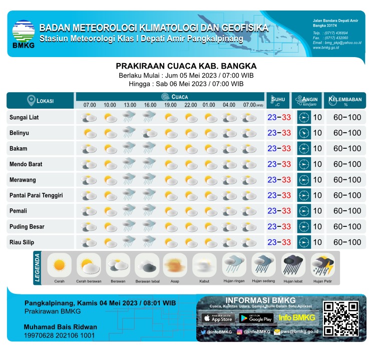 PRAKIRAAN CUACA KAB. BANGKA TANGGAL 05 MEI PUKUL 07.00 WIB HINGGA TANGGAL 06 MEI 2023 PUKUL 07.00 WIB