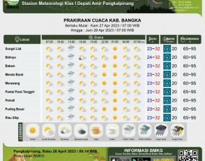 PRAKIRAAN CUCA KAB. BANGKA MULAI 27 APRIL 2023 PUKUL 07.00 WIB SAMPAI 28 APRIL 2023 PUKUL 07.00 WIB