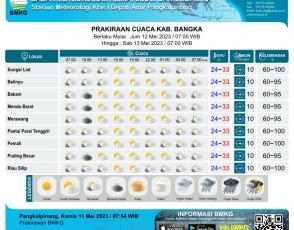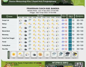 Pukul 07.oo WIB perkiaraan cuaca Kab. Bangka akan berawan. Pukul 10.00 WIB cuaca cerah berawan di Kec. Sungailiat, Belinyu, bakam, Merawang,...