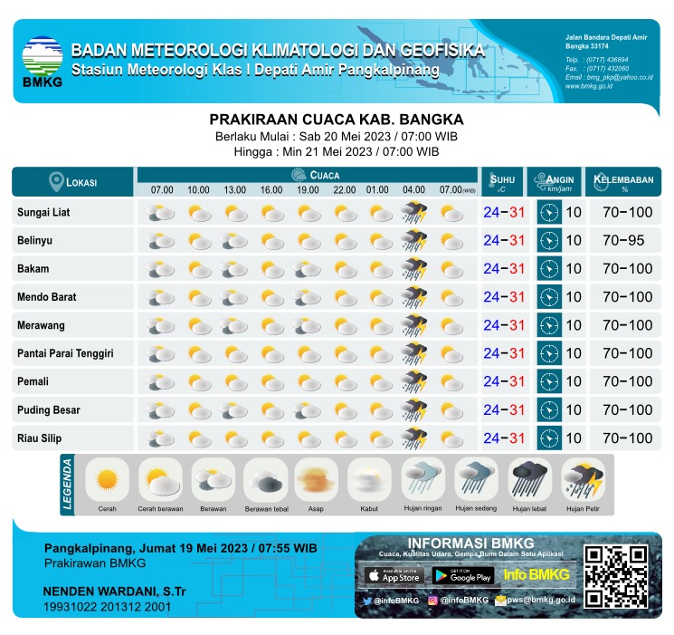 PRAKIRAAN CUACA KAB. BANGKA TANGGAL 20 MEI PUKUL 07.00 WIB HINGGA PUKUL 07.00 WIB TANGGAL 21 MEI 2023