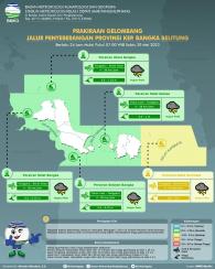 Prakiraan gelombang penyebrangan kategori rendah termasuk di perairan utara Bangka dengan perkiraan cuaca hujan petir dan arah dan kecepatan angin tenggara-barat daya 4--38 km/jam dan tinggi gelombang 0,5-1,25 m; Perairan Selat Gelasa cuaca hujan petir dan arah dan kecepatan angin timur laut- tenggara 4--28 km/jam dan tinggi gelombang 0,5-1 m; Perairan Selatan Bangka cuaca hujan petir dan arah dan kecepatan angin timur laut- tenggara 4--28 km/jam dan tinggi gelombang 0,5- 0,75 m; Perairan Selat Bangka cuaca hujan petir dan arah dan kecepatan angin tenggara-barat daya 4--28 km/jam dan tinggi gelombang 0,5- 0,75 m. Kategori sedang Perairan Selat Karimata cuaca hujan petir dan arah dan kecepatan angin tenggara-barat daya 4--47 km/jam dan tinggi gelombang 0,5- 2 m