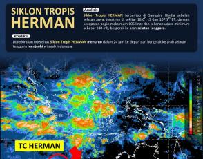 INFORMASI BKMG 01 APRIL 2023 Siklus tropis Herman terpantau di Samudra Hindia sebelah Selatan Jawa, tepatnya di sekitar 18.6° LS dan 107.1° BT, dengan kecepatan angin maks. 105 knot dan tekanan udara minimum sebesar 940 mb. Bergerak ke arah selatan...